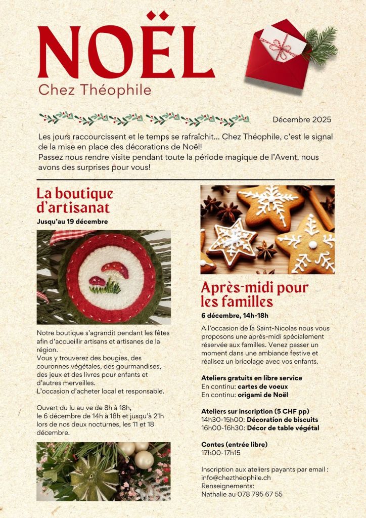 Chez Théophile est un projet associatif qui a pour but de valoriser un ancien complexe industriel. Ouvert à tous les publics, Chez Théophile se veut à la fois café/bar et lieu de divertissement, d’exposition et de création. Dès mi-novembre nous mettons en place notre boutique de Noël. Consultez notre journal de Noël pour découvrir les animations prévues pendant la période de l’Avent (cliquez sur l’image ci-dessous).